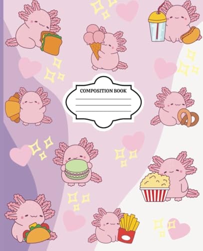 Axolotl Eating Composition Notebook: Wide Ruled Journal with a Cute Purple Heart Background - 7.5 x 9.25, 120 pages, Perfect for Kids, Teens and Adults
