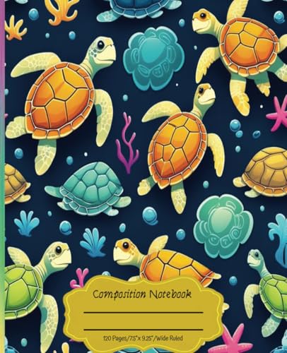 Composition Notebook: Colorful Abstract Sea Turtles on Dark Blue Background - 7.5" X 9.25" 120 Pages Wide Ruled