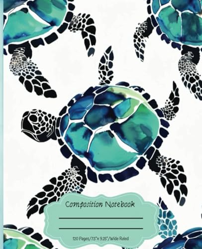 Composition Notebook:Ink Watercolour Blue Turquoise Abstract Sea Turtles on White Background - 7.5" X 9.25" 120 Pages Wide Ruled