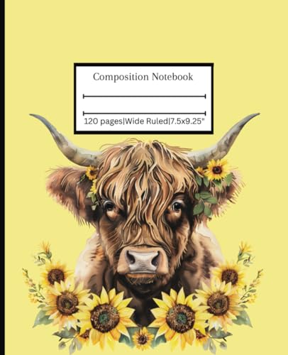 Highland Cow Composition Notebook |For Girls, Teens, Adults | Wide Lined |College, Work, Office | 7.5 x 9.25, 120 Pages