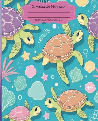 Composition Notebook: Colorful Pastel Sea Turtles Kawaii Style on Light Blue Background - 7.5" X 9.25" 120 Pages Wide Ruled