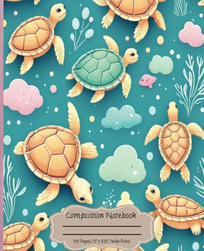 Composition Notebook: Pastel Colour Kawaii Style Abstract Sea Turtles on Light Blue Background - 7.5" X 9.25" 120 Pages Wide Ruled