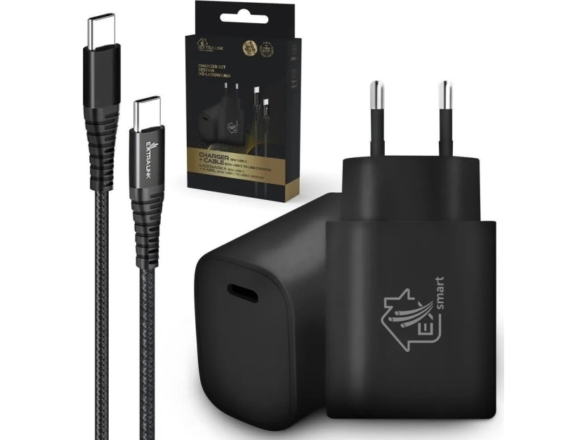 Ładowarka Extralink Extralink Smart Life Set02 Cable + Charger: 60W 20V 3A, Usb-C-Usb-C, 200Cm / 18W Pd3.0 5V/3A 9V/2A (Black)