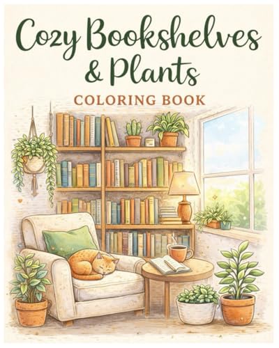 Cozy Bookshelves & plants: A Relaxing Adult Coloring book of Cozy Reading Nooks, Bookshelves, and Lush Indoor plants.