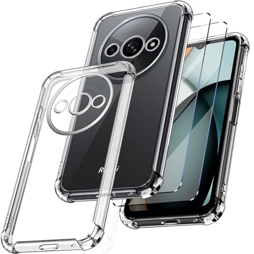 New&Teck Fodral för Xiaomi Redmi A3 + 2 skärmskydd i härdat glas, mjukt TPU-silikonfodral, stötfångare med förstärkta hörn, klart skydd. (transparent)