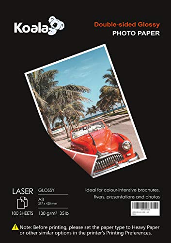 KOALA Ljust dubbelsidigt fotopapper för LASER-skrivare, A3, 130 g/m², 100 ark. Lämplig för utskrift av foton, broschyrer, certifikat, häften, flygblad, flygblad, kalendrar, kort