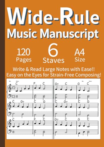 Wide-Rule Music Manuscript - 120 Blank Staff Paper for Easy Reading & Writing A4 English: Large Print Blank Music Manuscript for Adults with Low ... Practice, Lessons & Songwriting (Orange)