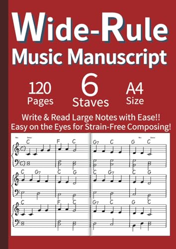 Wide-Rule Music Manuscript - 120 Blank Staff Paper for Easy Reading & Writing A4 English: Large Print Blank Music Manuscript for Adults with Low ... Practice, Lessons & Songwriting (Red)