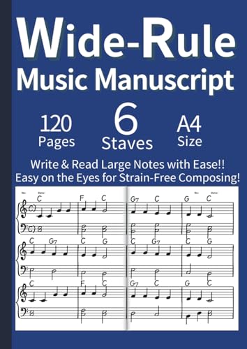 Wide-Rule Music Manuscript - 120 Blank Staff Paper for Easy Reading & Writing A4 English: Large Print Blank Music Manuscript for Adults with Low ... Practice, Lessons & Songwriting (Blue)