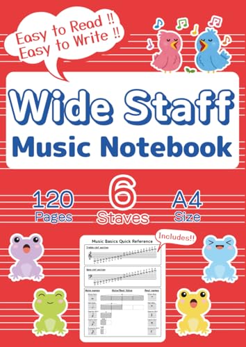 Kids Wide Staff Music Notebook - A4 Size -: Blank Staff Paper for Beginners and All Ages with Music Basics Reference,120pages, Wide 6 Staves per page,Red