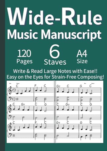 Wide-Rule Music Manuscript - 120 Blank Staff Paper for Easy Reading & Writing A4 English: Large Print Blank Music Manuscript for Adults with Low ... Practice, Lessons & Songwriting (Green)