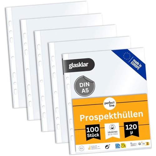 perfekt line 100 plastmappar DIN-A5, plastfickor för A5-papper, transparent, Kristallklara, släta, extra starka, robusta premiumark, syrafria, Dokumentsäkra, Made in EU