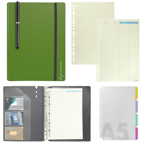 ZephyrCraft A5 ringpärm, påfyllningsbar, 6 ringar, A5-bindemedel med påfyllningspapper och skiljeblad, budgetplanerare, anteckningsbok för kontor, skola, researbete, inkl. penna (grön)