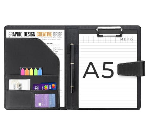 Agoer A5 Läder Urklipp mapp Faux Konferensmappar med magnetiskt stängningsskydd, svart affärsmapp Foldover med A5-papper, klibbiga pilflikar, penna, multifunktionella dokumentmappar för arbete