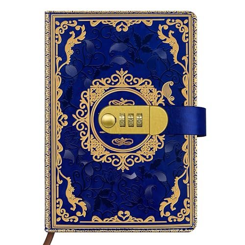Qefuna dagbok med lås, A5 PU läder dagbok med kod 200 sidor, 100Gsm papper, vintage läsdagbok dagbok med lås för kvinnor och män, (Blå)