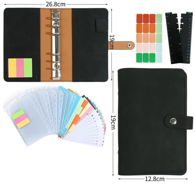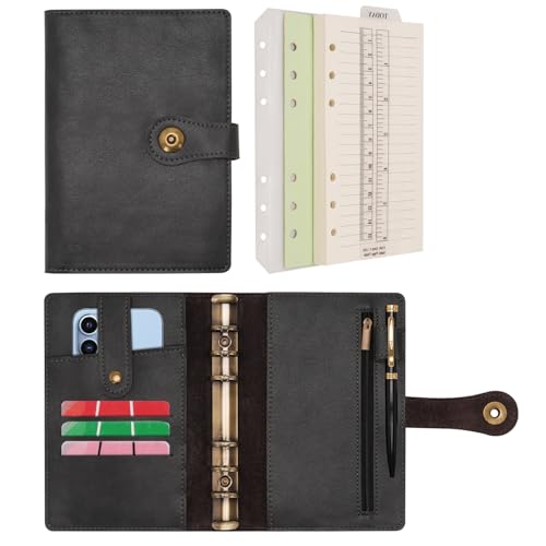 HAUTOCO A6 Anteckningsbok i PU-läder, påfyllningsbar, 6 ringmappar för A6-fyllningspapper och kontanter, budgetkuvert, lösa blad, personlig planerare, pärm med magnetiskt spänne, svart