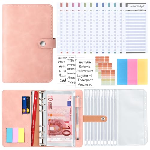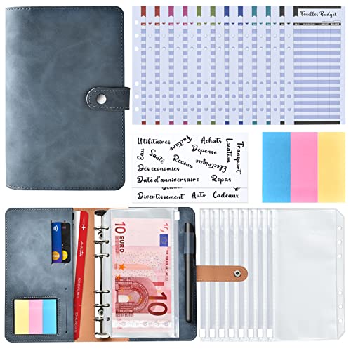 AiQInu A6-pärm, PU-läder budgetplanerare omslag med 10 PVC-budgetkuvert, 12 budgetark på franska, 3 franska ordklistermärken och 3 klistermärken