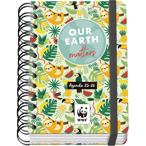 Dohe - Skolkalender 2025 2026 - Dag per sida, Storlek A6 (12x17 cm), Spanska och Engelska, Dubbelspiralbindning och Resårband, Hårt omslag, 4 Klistersidesark - WWF Tropic