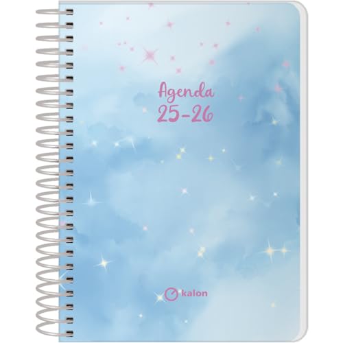 Q Kalon - Skolkalender 2025 2026 - Dag per sida, Storlek A6 (12x17 cm), Spanska och Engelska, September till Juni, Spiralbindning, Mjukt omslag med plastskydd - Sky
