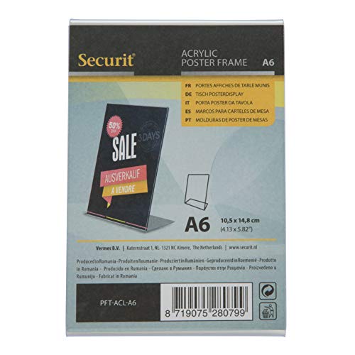 EUROPEL Skylthållare, L-standard, A6-storlek, porträtt – genomskinlig akrylaffisch, meny och broschyrhållare för restauranger, hotell, konferens och reception – fristående och snedställd design