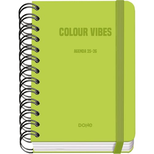 Dohe - Skolkalender 2025 2026 - Dag per sida, Storlek A6 (12x17 cm), Spanska och Engelska, Dubbelspiralbindning och Resårband, Hårt omslag, 4 Klistersidesark - COLOUR VIBES Lime