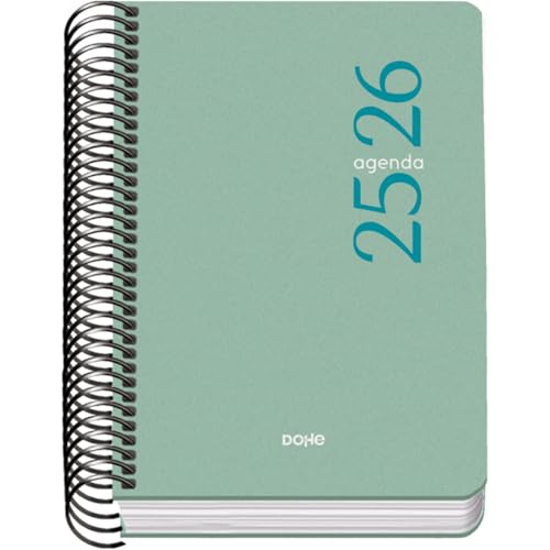 Dohe - Skolkalender 2025 2026 - Dag per sida, Storlek A6 (12x17 cm), Spanska och Engelska, Dubbelspiralbindning och Resårband, Hårt omslag, 4 Klistersidesark - SERENITY Grön