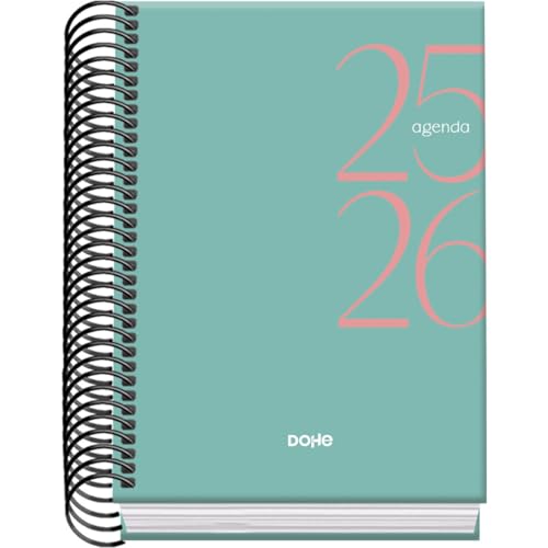 Dohe - Skolkalender 2025 2026 - Dag per sida, Storlek A6 (12x17 cm), Spanska och Engelska, September till Juni, Spiralbindning och Resårband, Hårt omslag, 4 Klistersidesark - PRIME Logic