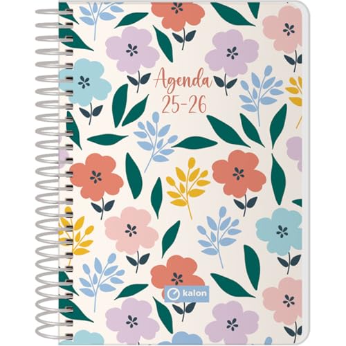 Q Kalon - Skolkalender 2025 2026 - Dag per sida, Storlek A6 (12x17 cm), Spanska och Engelska, September till Juni, Spiralbindning, Mjukt omslag med plastskydd - Garden