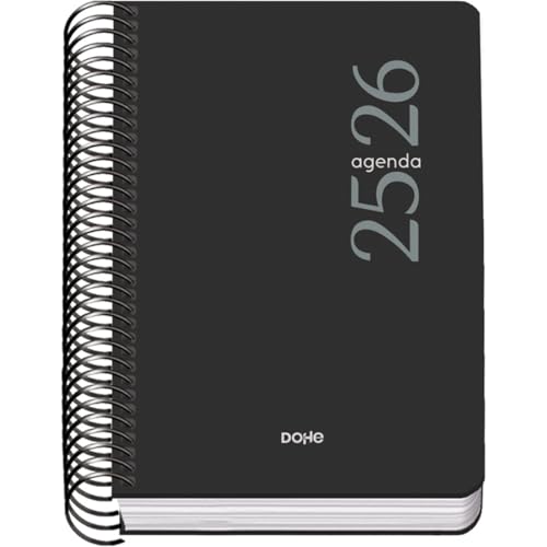 Dohe - Skolkalender 2025 2026 - Dag per sida, Storlek A6 (12x17 cm), Spanska och Engelska, September till Juni, Spiralbindning, Hårt omslag - SYSTEM Svart