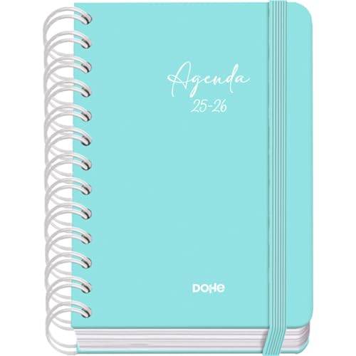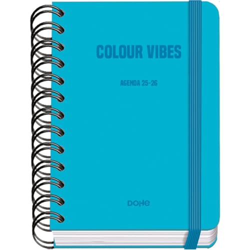 Dohe - Skolkalender 2025 2026 - Dag per sida, Storlek A6 (12x17 cm), Spanska och Engelska, Dubbelspiralbindning och Resårband, Hårt omslag, 4 Klistersidesark - COLOUR VIBES Cyan