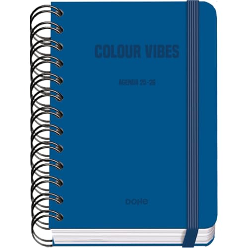 Dohe - Skolkalender 2025 2026 - Dag per sida, Storlek A6 (12x17 cm), Spanska och Engelska, Dubbelspiralbindning och Resårband, Hårt omslag, 4 Klistersidesark - COLOUR VIBES Blå