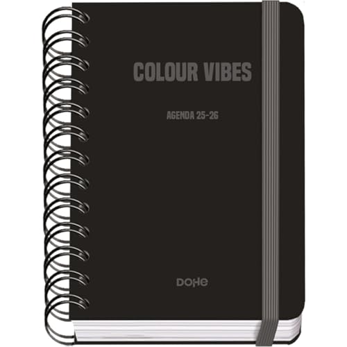 Dohe - Skolkalender 2025 2026 - Dag per sida, Storlek A6 (12x17 cm), Spanska och Engelska, Dubbelspiralbindning och Resårband, Hårt omslag, 4 Klistersidesark - COLOUR VIBES Svart