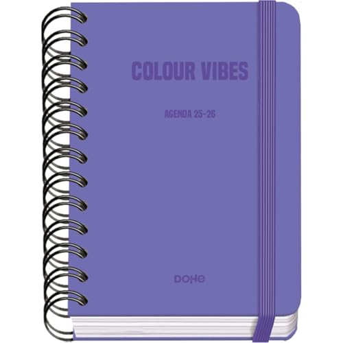 Dohe - Skolkalender 2025 2026 - Dag per sida, Storlek A6 (12x17 cm), Spanska och Engelska, Dubbelspiralbindning och Resårband, Hårt omslag, 4 Klistersidesark - COLOUR VIBES Lila