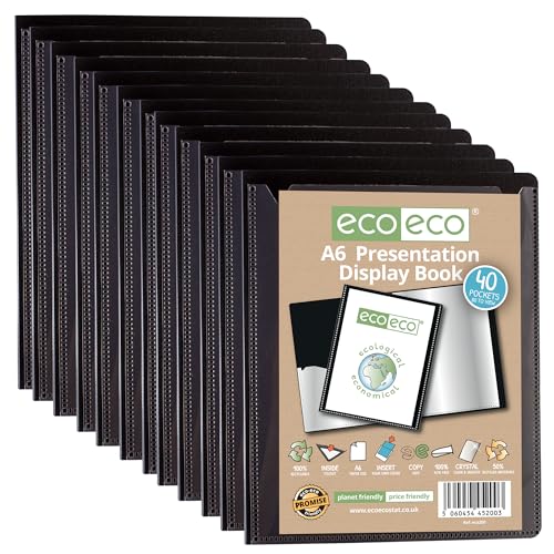 eco-eco A6 storlek 50 procent återvunnen 40 fickor svart presentationsbok, förvaringsfodral, portfölj, konstmapp med plastärmar, förpackning med 12 mappar, eco200x12