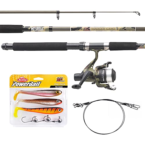 Mitchell 1555890 Tanager kamouflage fiskeset bestående av en spö- och rullkombination med snöre och bete för fiske av gädda, gös och abborre, grön kamouflage