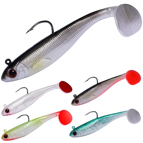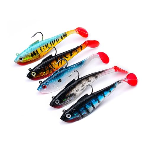 5 st fiskedrag med gummifisk och jigghuvud - konstgjort bete för abborre, gös och öring - paddelsvansad gummifisk (8 cm) - lämplig för både söt- och saltvatten