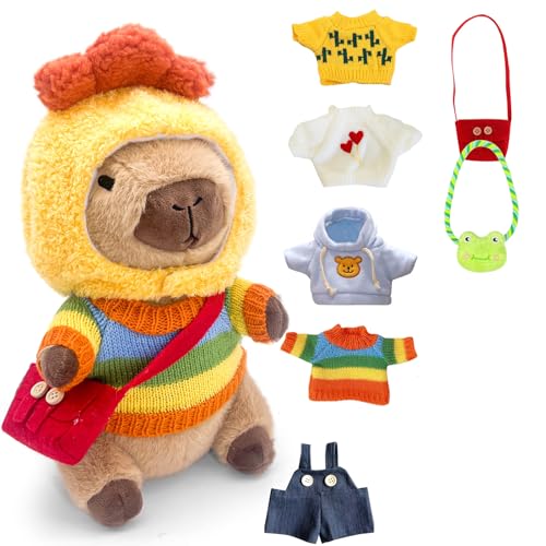 XEERUN Capybara plyschdjur med kläder och accessoarer, 23 cm Capybara gosedjur, söt Capybara plysch, klä upp Capybara plyschdjur med hatt 4 kläder, 2 fickor byxor för barn, flickor, pojkar