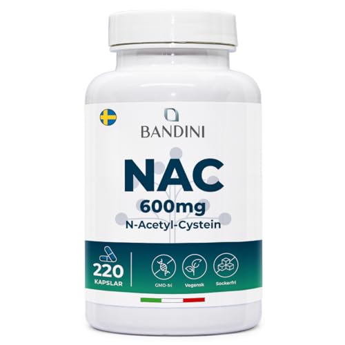 Bandini® NAC N-Acetyl-Cystein 220 kapslar 600 mg (+7 månader), Glutationprekursor, Acetylcystein 600mg, 1 kapsel per dag, Hög dos av N Acetyl Cystein ökad, 100% veganskt tillskott