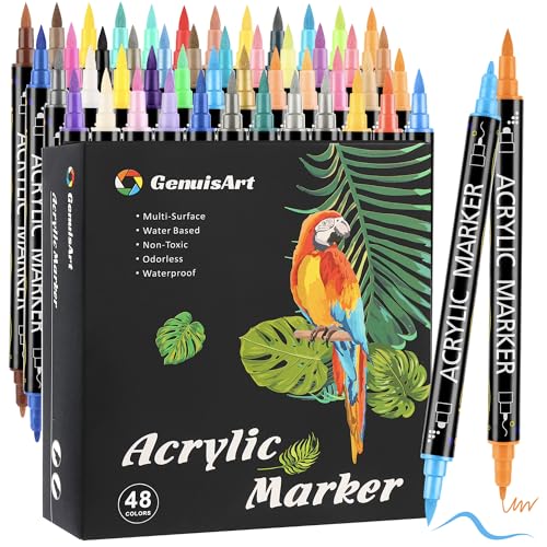 Sanweyter Acrylic Paint, Acrylic Markers Akrylfärgpennor 24 48 6080 färger med dubbla spetsar fin och pensel, vattentäta och för sten, ägg, trä, glas, keramik, duk (48)