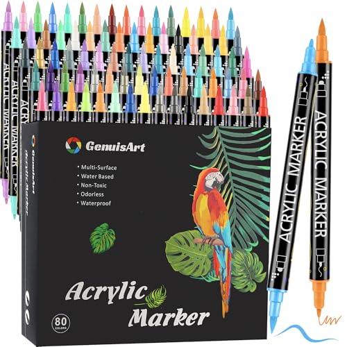 Sanweyter Acrylic Paint, Acrylic Markers Akrylfärgpennor 24 48 6080 färger med dubbla spetsar fin och pensel, vattentäta och för sten, ägg, trä, glas, keramik, duk (80)
