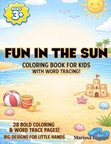 Fun in the Sun Coloring Book for Kids with Word Tracing: Bold and Easy Designs for Early Learning, Summer Activity Book with Simple Pictures featuring Beach Toys and Themes, Summer Fruits and Food