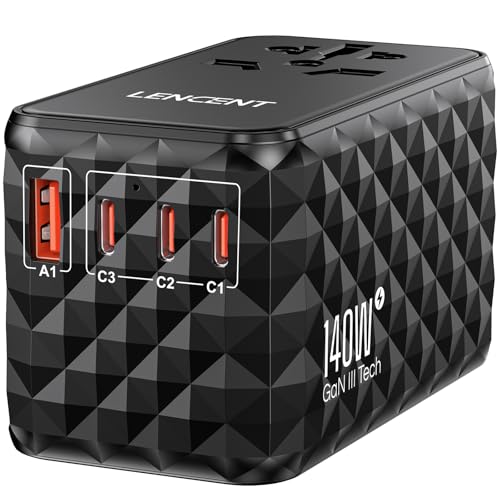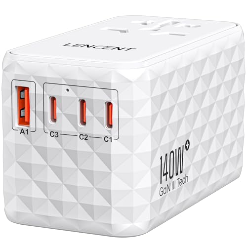 LENCENT 140W Snabb Laddning Universal Reseadapter över Hela Världen, GaN III Internationell Travel Adapter med 3 PD3.1 Typ C+1 QC USB A, Socket Adapter Worldwide för DE USA UK IT AUS CN, Typ C/G/A/I