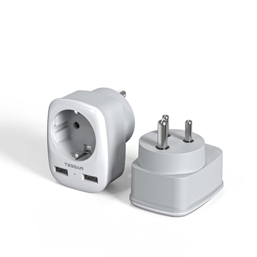 TESSAN 2-pack reseadapter Indien med USB, 3-i-1 resekontakt Indien strömadapter, adapter för Sri Lanka, Nepal, 1-vägs adapter, uttag med 2 USB, 2 500 W typ D uttagsadapter grå