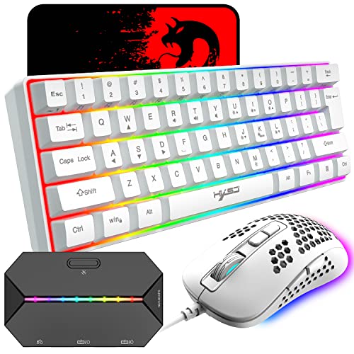 60% Trådbundet kompakt speltangentbord, 61 tangenter, 11 RGB bakgrundsbelysning, fulla tangenter, anti-ghosting + trådbunden lätt spelmus, 2400 DPI, optisk mus + adapter för PS4/Xbox-spelare (vit)