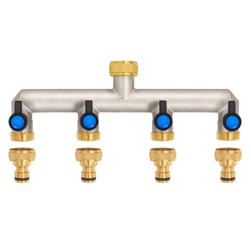 4-vägs vattenkran vattenfördelare av mässing för 4 enheter/trädgårdsslangar, 4 distributör 3/4 tum adapter 1/2 tum med kulventil för att justera och stänga av vattenflödet