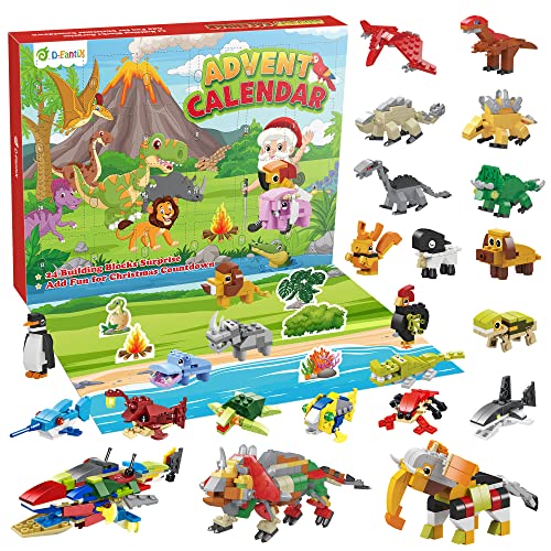 D-FantiX Jul adventskalender för barn, 24-i-3 mini dinosaurier djur byggklossar leksaksset, 24 dagar jul nedräkningskalender, överraskningspresent för pojkar flickor