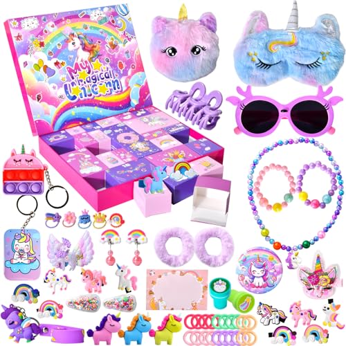 Enhörning adventskalender flicka 2025, jul nedräkning kalender, med 24 dagars överraskningar presenter för barn flickor, överraskningspaket med smycken hårsmycken leksaker