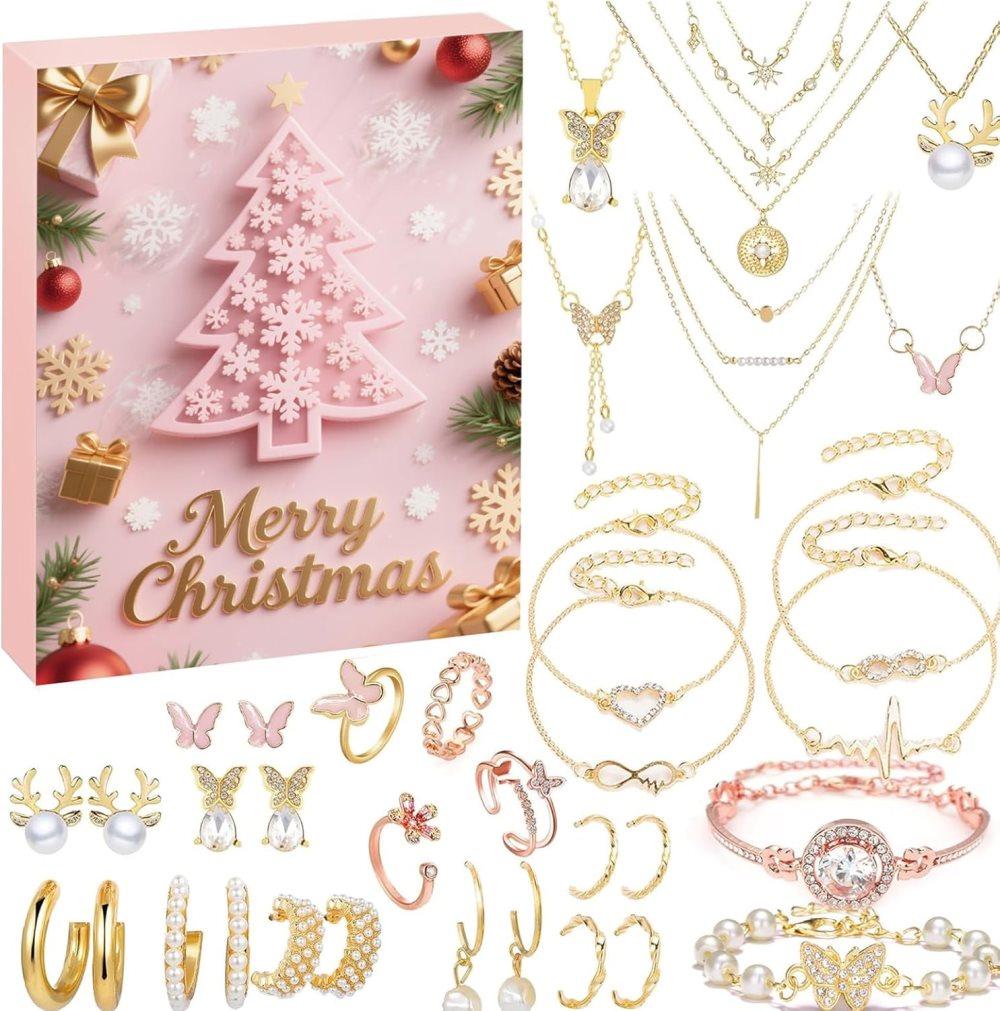 Adventskalender smycken 2025, julkalender kvinnor och flickor, 24 överraskningar, armband, halsband, örhängen, smycken i set, julklappar för kvinnor flickor tonåringar och barn