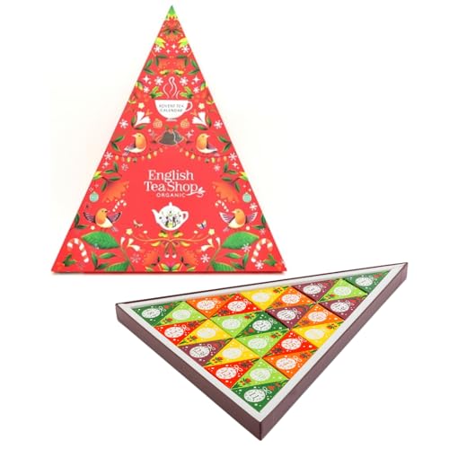 English Tea Shop® | Trianglar adventskalender | 25 Mini ekologiska te- och örtteaskar till jul | Adventsröd presentförpackning - 25 tepyramider (50 gr) | EKOLOGISKT örtte