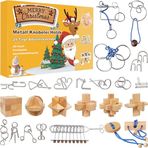 Adventskalender 2025 pusselspel för vuxna och barn, 24 dagar med present, jul med metallknobeli och 3D-trä, 3D-pussel skicklighetsspel för pojkar, flickor, ungdomar